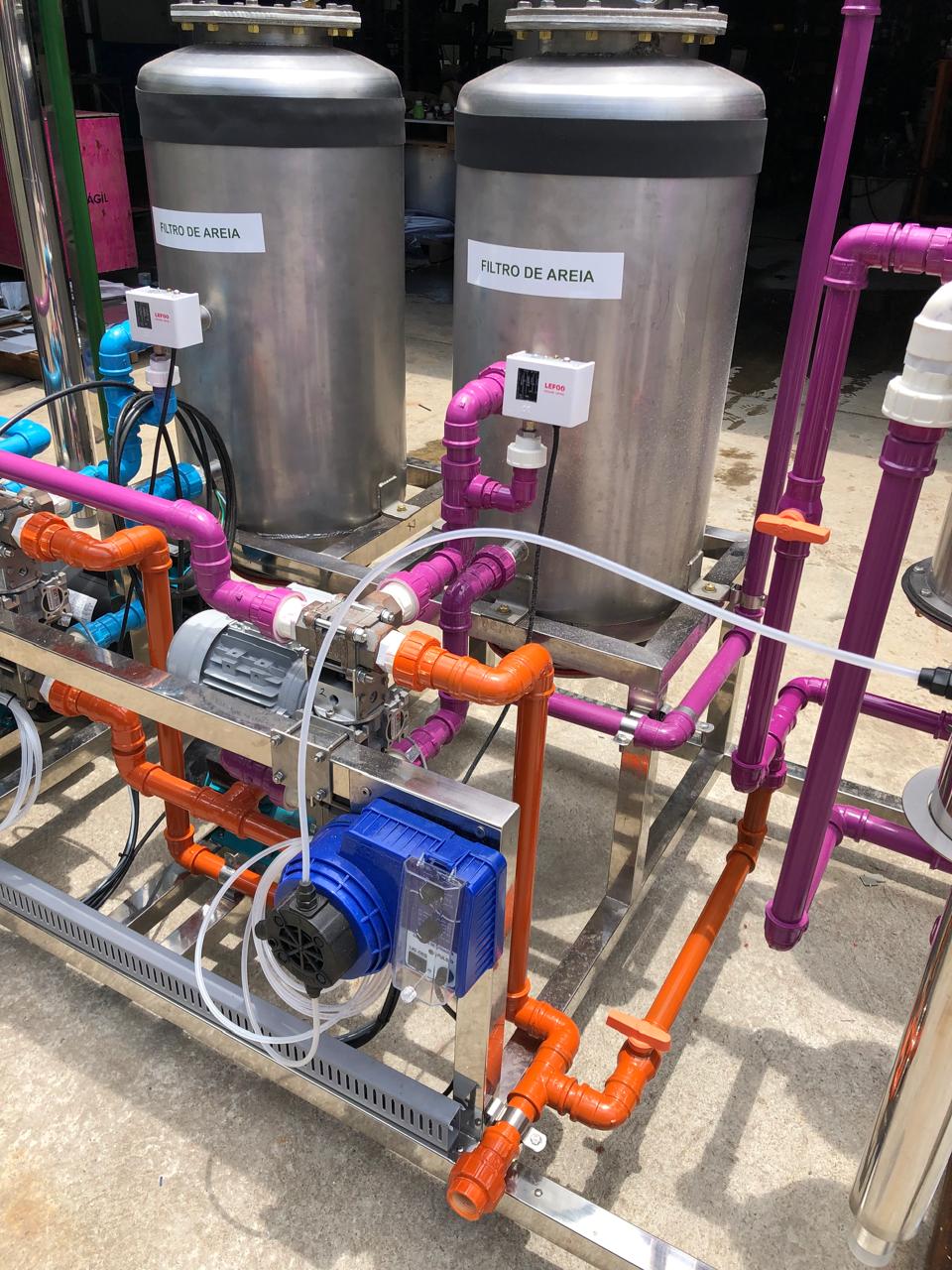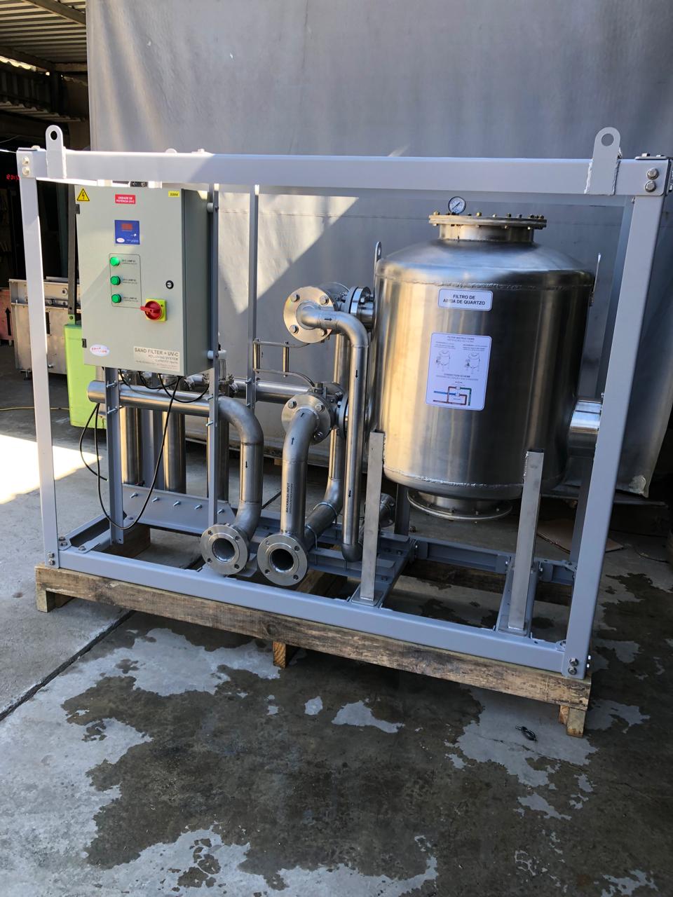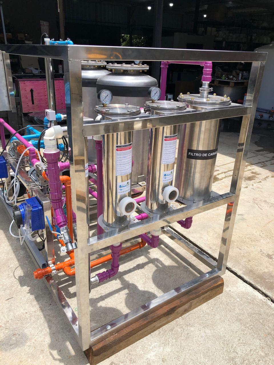 Equipamentos construídos em aço inox e montados em SKID (plataforma) para tratamento de águas de poços, chuva, potabilização, melhoramento da água de companhias, reuso de águas, entre outros.