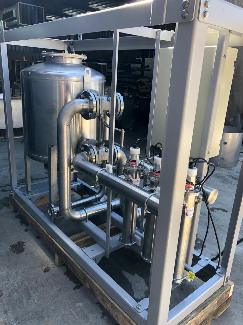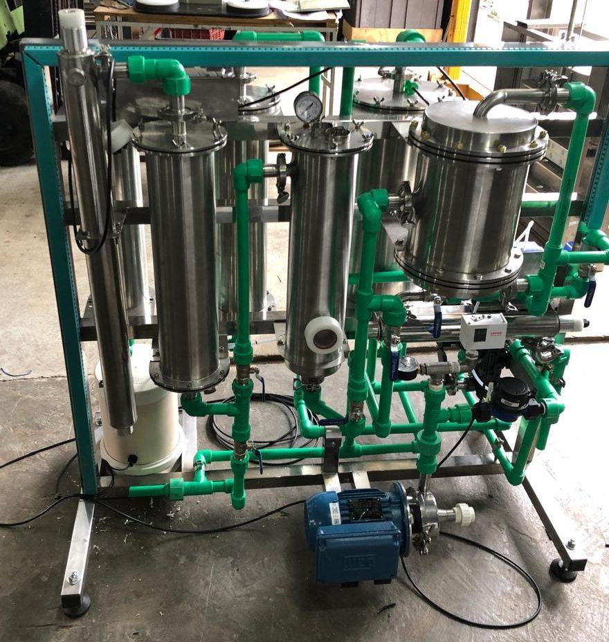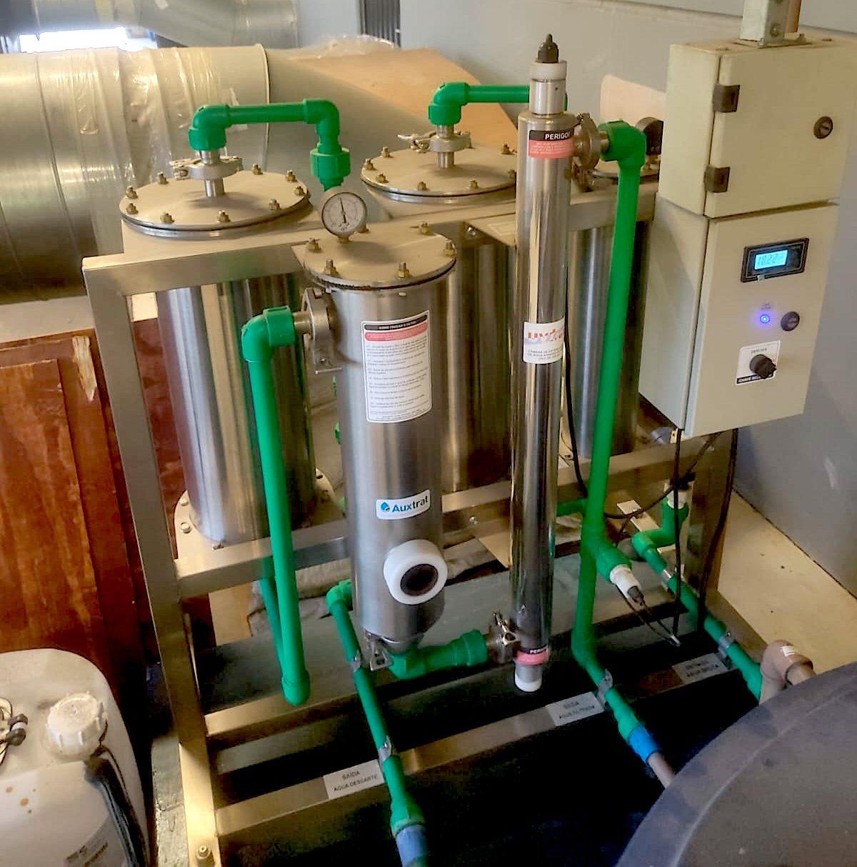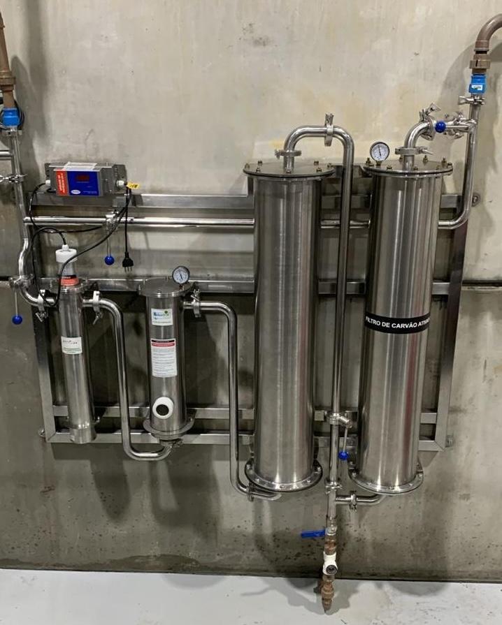 SKID para melhoramento da água para fabricação de cerveja. Sua tubulação é de aço inoxidável (conexões sanitárias).